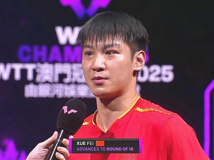 其实薛飞最开始并未获得本次澳门冠军赛的参赛资格,直到开赛前几日,德国名将奥恰洛夫退赛,薛飞才递补参赛,不过薛飞在首轮就需要对阵日本名将张本智和,后者才拿到WTT横滨冠军赛的冠军,状态正盛,所以赛前外界普遍看衰薛飞,然而比赛开始后,薛飞就打得很主动,跟张本智和打起对攻,首局战成7平时,薛飞连得4分,以11-8先胜一局,第二局,双方陷入缠斗,比分战成7平时,薛飞再度发力,以同样的11-8再胜一局,第三局,张本智和背水一战,跟薛飞缠斗到了9平,随后薛飞连得2分,以11-9锁定胜局,从而以总比分3-0送张本智和一轮游,并且张本智和出局,还意味着日本男队提前全军覆没。